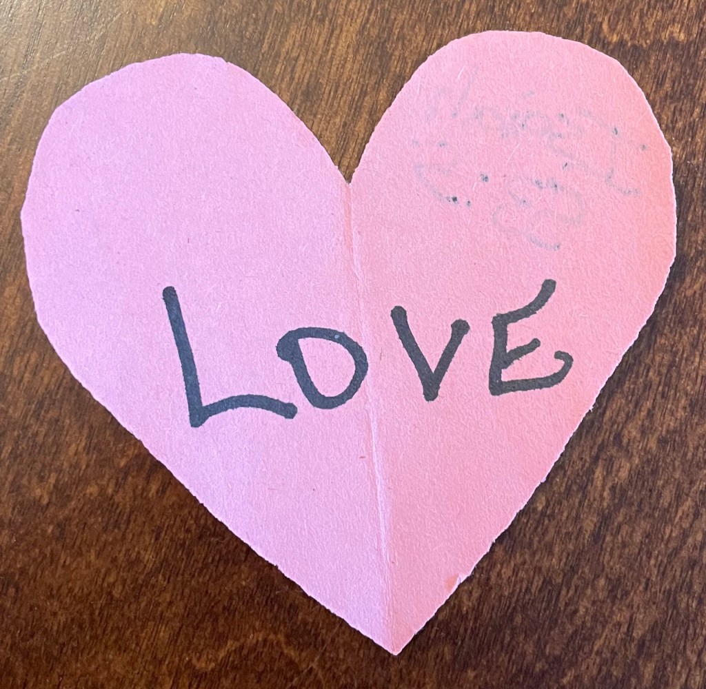 While the neurology appointment itself was fairly mundane (yay for a boring appointment!), it was an interaction in the waiting room that has kept me thinking. I arrived to a pretty full room and took a seat near a woman in a wheelchair. As I started staring into my phone as we do in waiting rooms these days, she reached over and silently handed me a construction paper heart with the word “love” written in Sharpie on one side and a verse of scripture on the other. I took it, smiled, and politely said thank you. Then, I noticed that she had created a full craft zone. She had taken up a couple chairs with her construction paper, scissors, and pens. What is this lady up to???